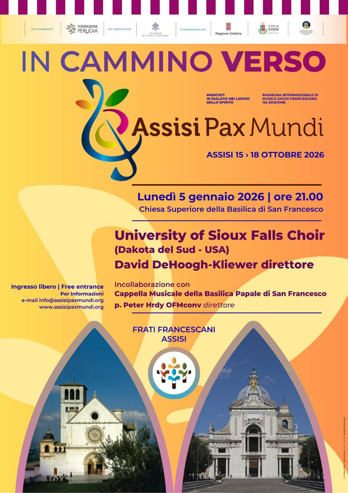 Vi aspettiamo lunedì 5 gennaio alle ore 21.00 nella Chiesa Superiore con un concerto dell’University of Sioux Falls Choir (USA) e la partecipazione della Cappella Musicale della Basilica Papale di San Francesco.